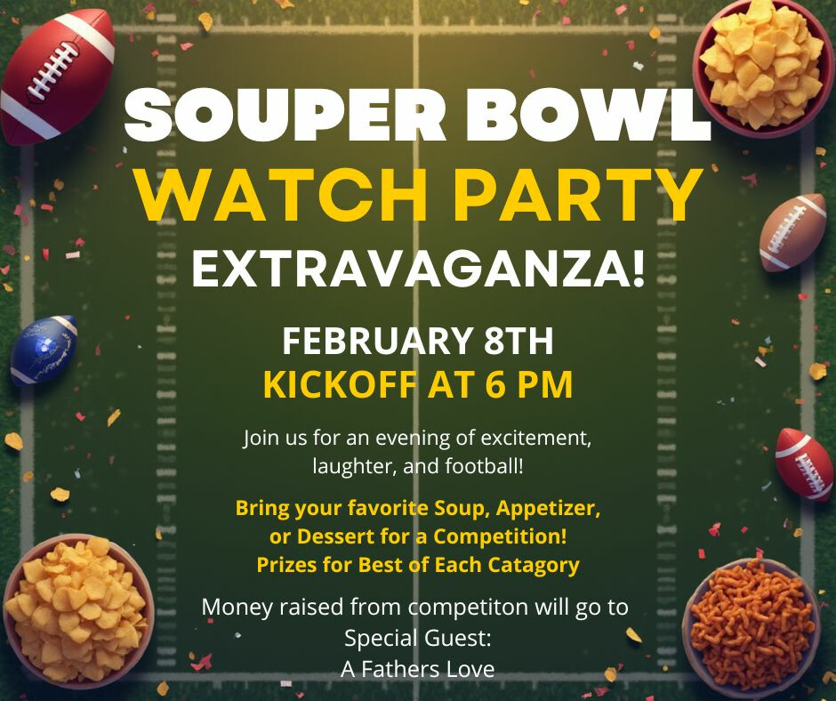 Join us on Super Bowl Sunday for our 'Souper Bowl'! Bring your favorite soup, appetizer, and/or dessert and compete for a prize. Votes will be cast by giving money to each entrant and whichever item ends with the most money will win the prize. The money collected will go to Father's Love here in Shelbyville. For more information on Father's Love, click here.